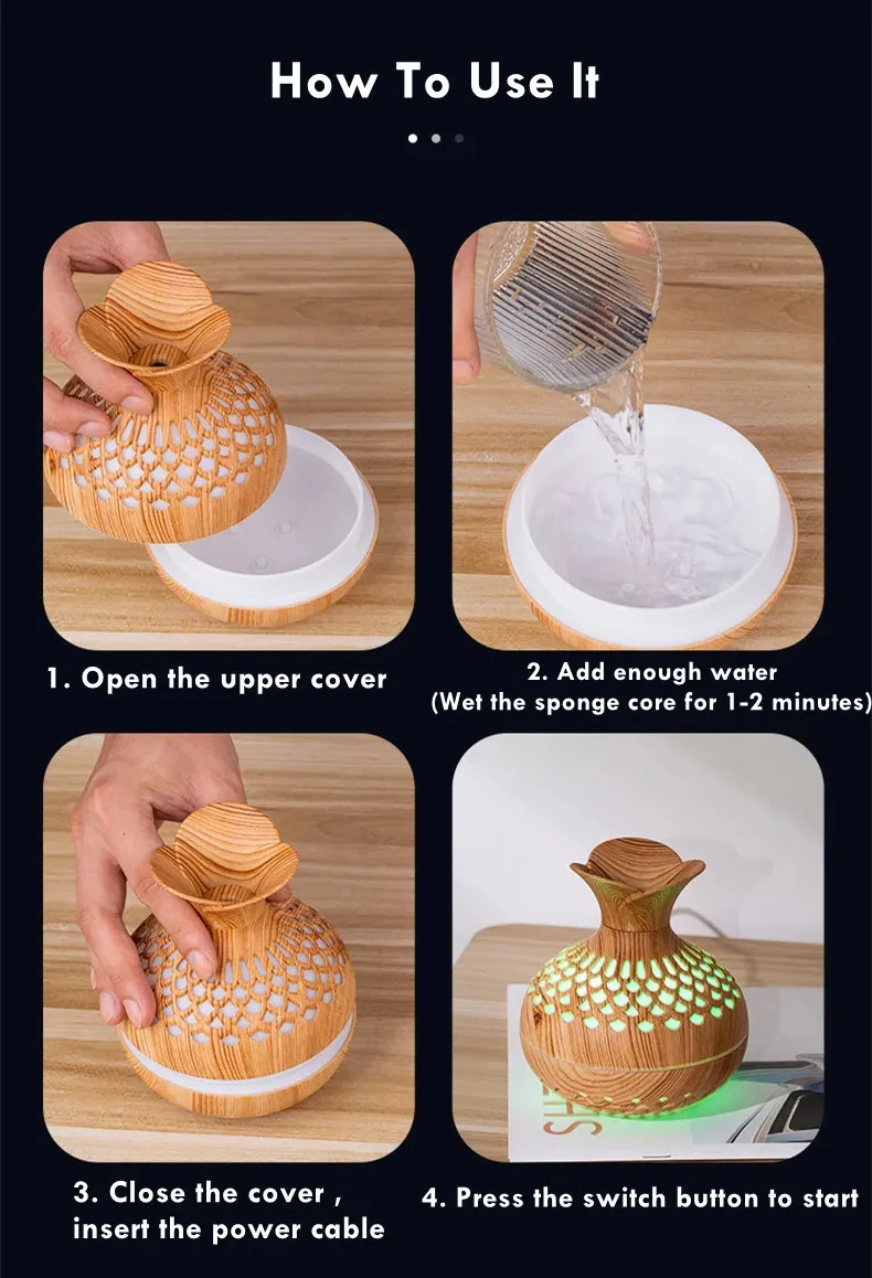 The diffuser is easy to use, simply add water and essential oils, then turn it on to enjoy the therapeutic benefits.